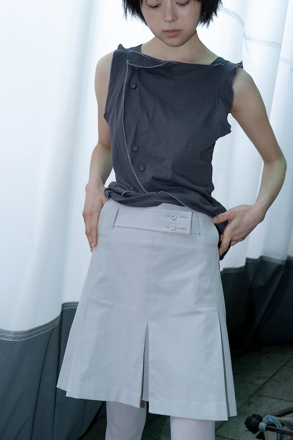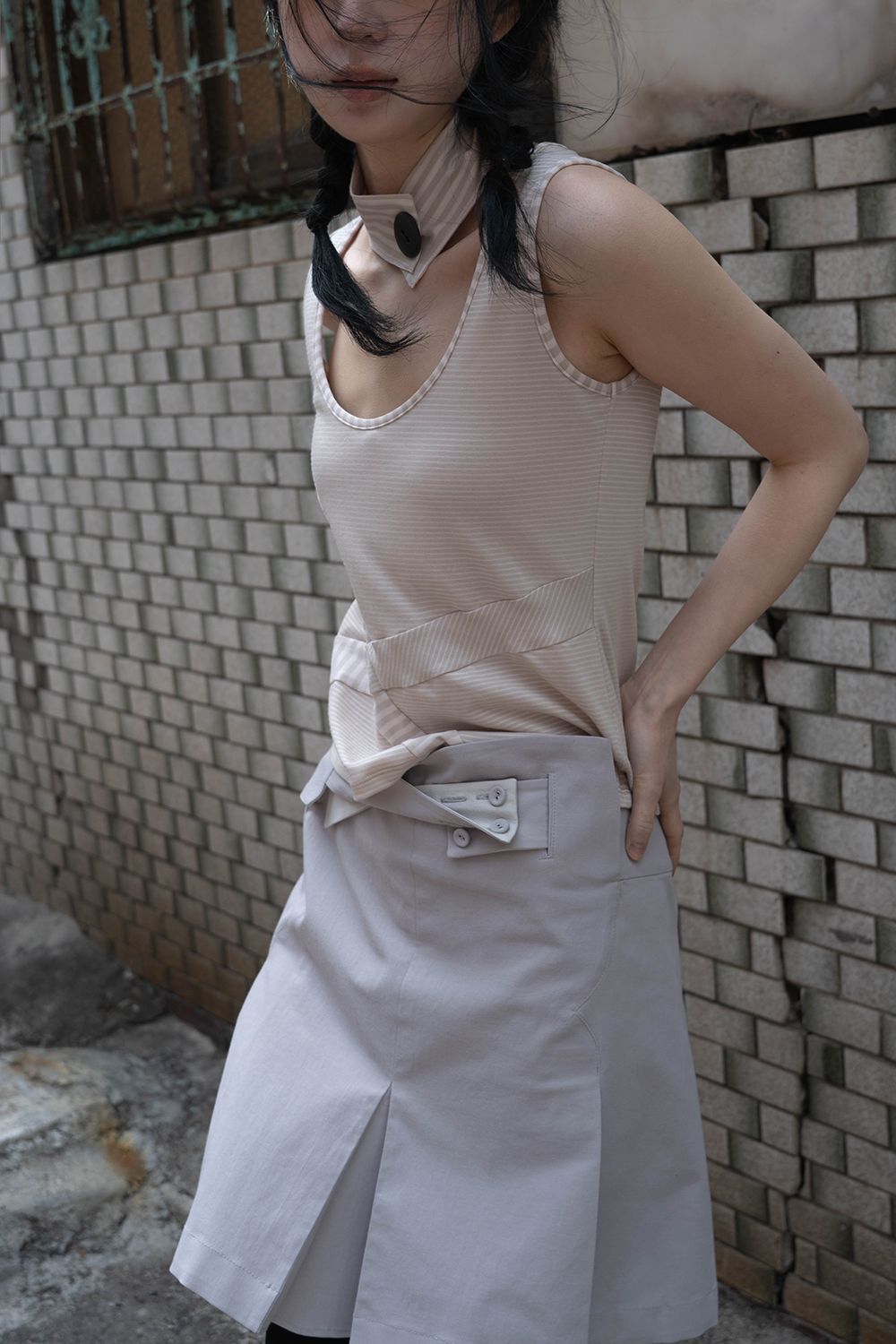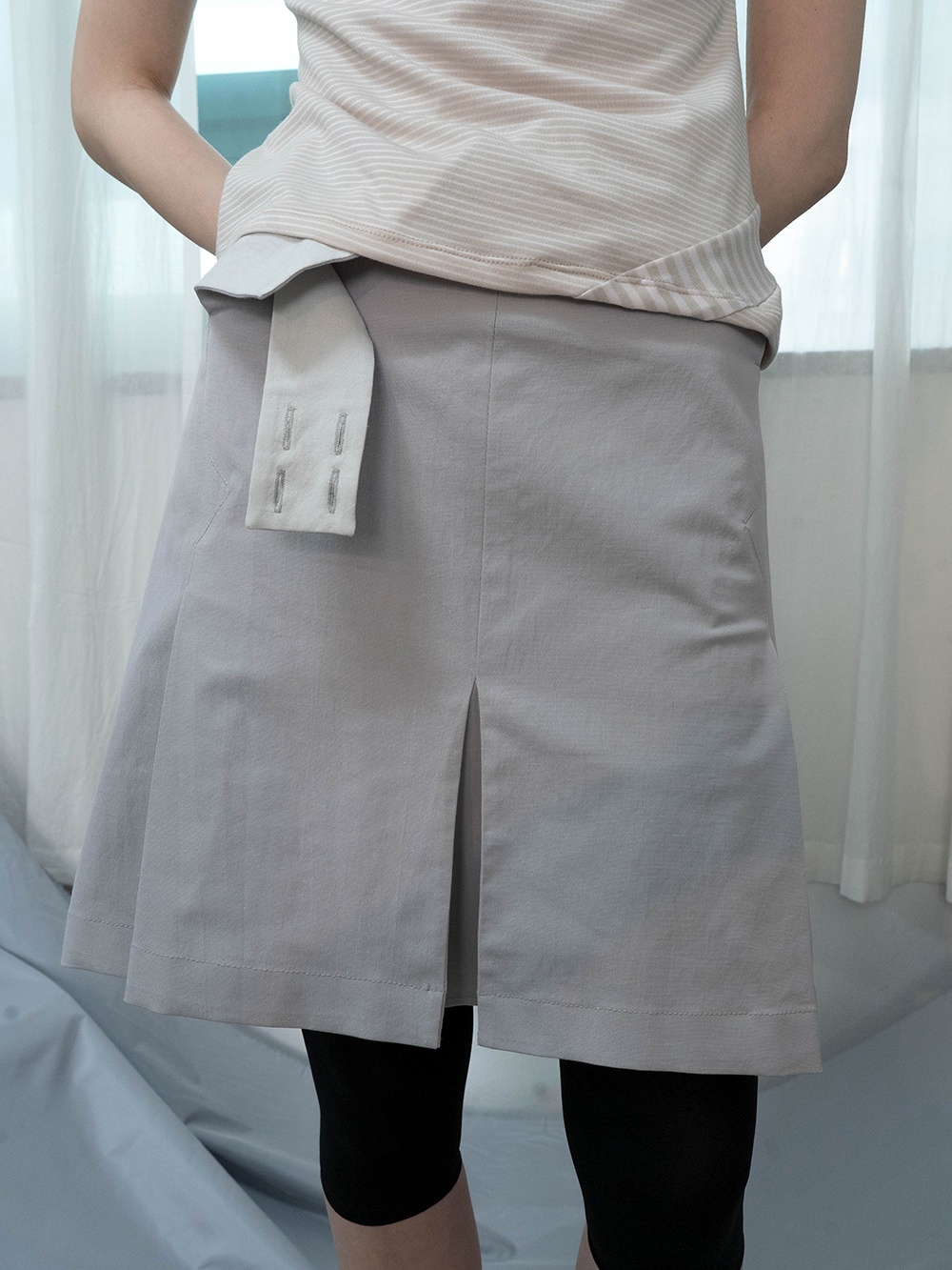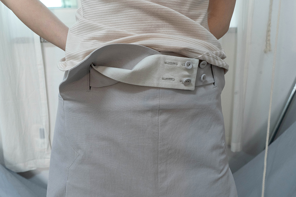 앞 벨트와 허리에 톤온톤 배색 안감 사용